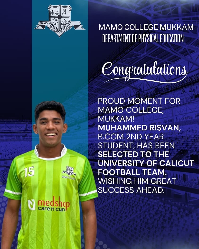 Muhammed Risvan, a second-year B.Com student of MAMO College, Mukkam, has been selected to represent the University of Calicut Football Team. This achievement is a proud moment for the college and the Department of Physical Education. The management and staff extend their best wishes to him for continued success.