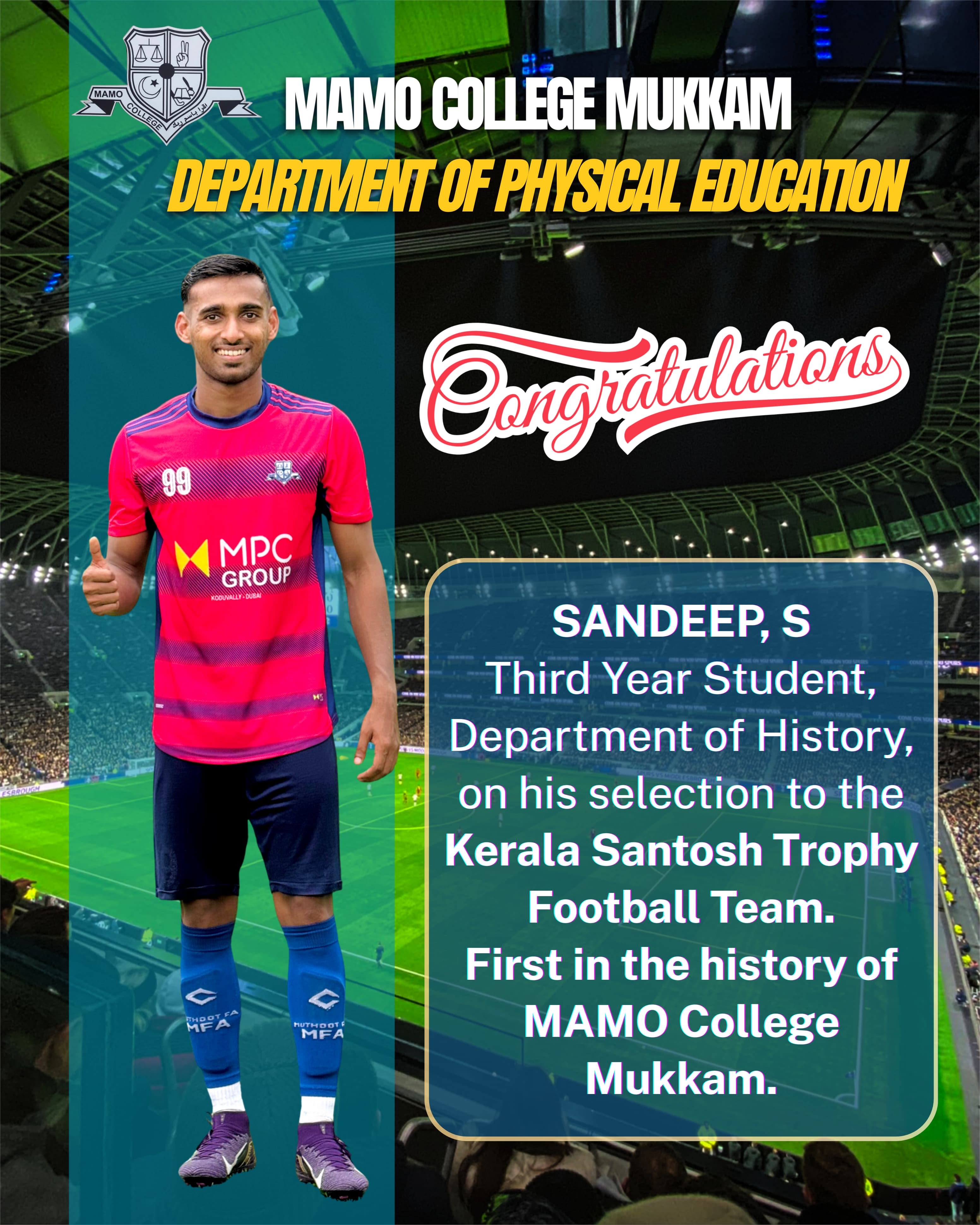 Congratulations .. MAMO College, Mukkam congratulates Sandeep S, Third Year, Department of History, on his selection to the Kerala Santosh Trophy Football Team. This is a historic first for MAMO College, Mukkam. Wishing him continued success and excellence. — Department of Physical Education